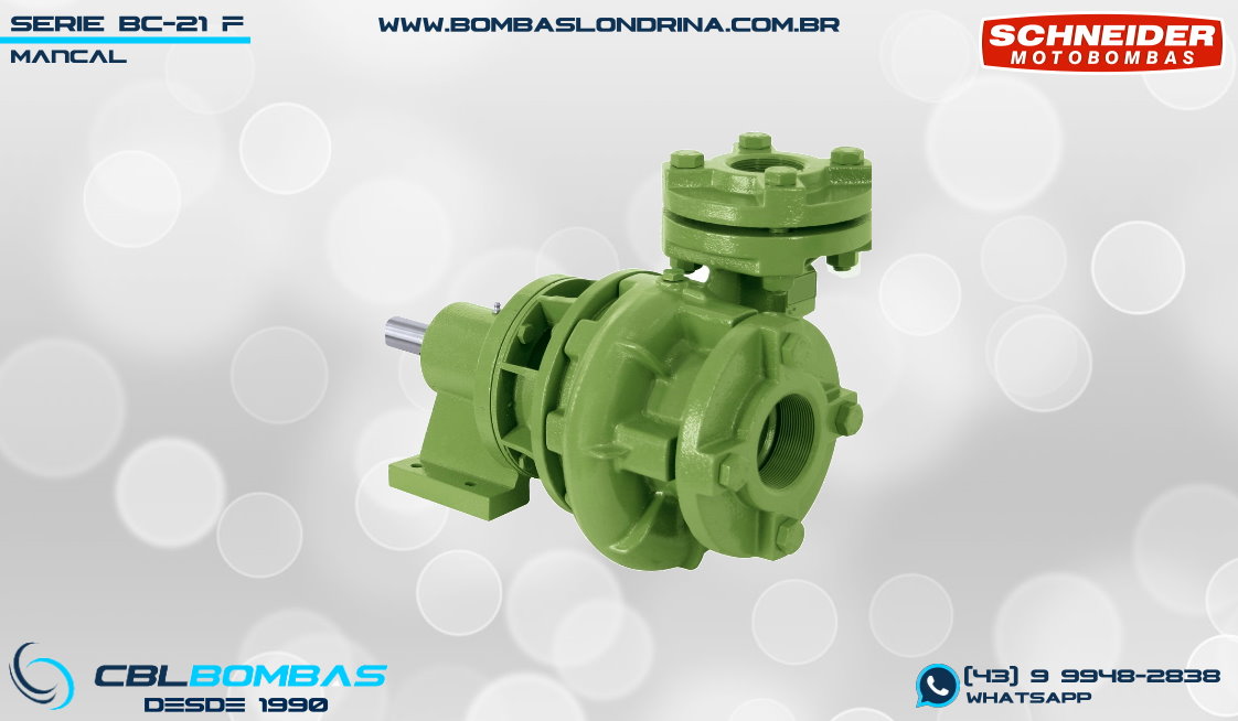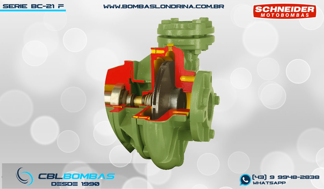 O modelo BC-21 F 2 faz parte da terceira versão da série BC-21. A nomenclatura “F” indica bocais FLANGEADOS de 2 1/2″ x 2″ (sucção x recalque) conforme Norma DIN 1092 1, fornecidos com contra flanges inclusas. O design do corpo é do tipo “caracol” com entrada central e saída lateral superior.