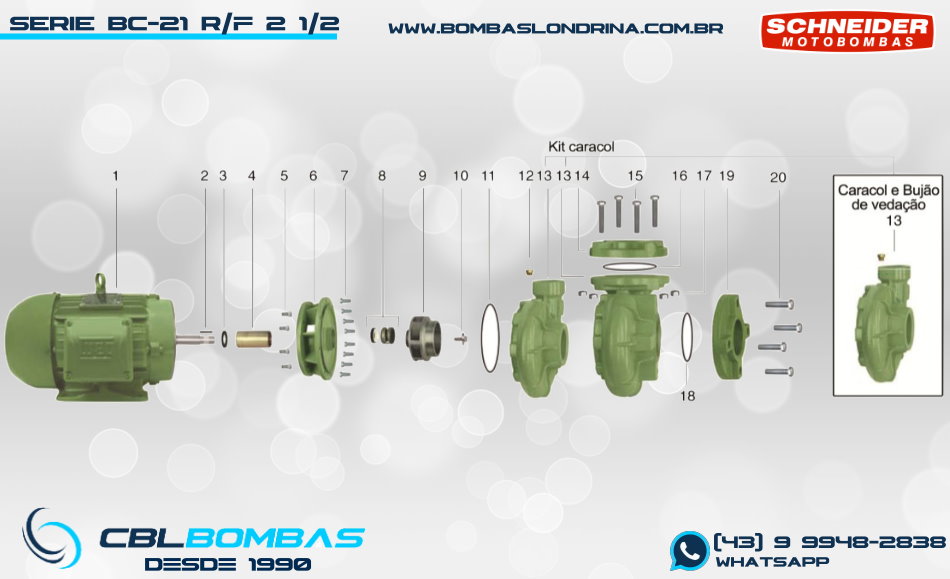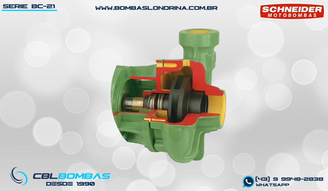 O modelo BC-21 R 2 1/2 é a maior versão da série BC-21. A nomenclatura “R” indica bocais ROSQUEADOS que são de 3″ x 2 1/2″ (sucção x recalque) padrão BSP. O design do corpo é do tipo “caracol” com entrada central e saída lateral superior. Possui vazões elevadas (até 149 m³/h) com pressões baixas e está disponível em motorizações que vão de 5,0cv até 15,0cv (todos WEG IP-55 Fechados), o que acaba proporcionando uma elasticidade de curvas em alta vazão, permitindo uma grande gama de utilizações.
