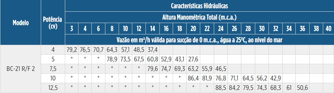 O modelo BC-21 R 2 é a terceira versão da série BC-21 e possui as vazões elevadas (até 88,5 m³/h) e atende pressões baixas. Está disponível em motorizações que vão até 12,5cv (todos WEG IP-55 Fechados), o que acaba proporcionando uma elasticidade de curvas em alta vazão, proporcionando uma grande gama de utilizações.