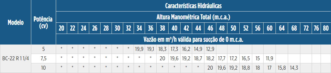 A bomba BC-22 R 1 1/4 é o terceiro modelo da série BC-22 e possui apenas 3 opções de potência (5,0 cv / 7,5 cv / 10,0 cv).