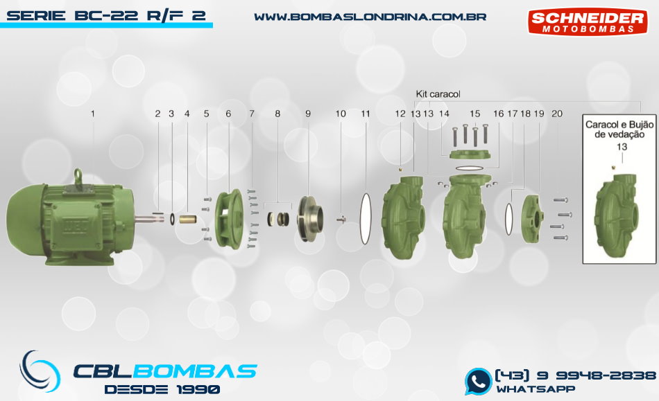 A bomba BC-22 R 2 é o maior modelo da série BC-22 e possui 5 opções de potência: 10,0cv | 12,5cv | 15,0cv | 20,0cv | 25,0cv. (veja comparativo de versões abaixo) Esta bomba foi desenvolvida para atender uma faixa de altas vazões ( até 92m³/h) somada a uma faixa elástica em termos de pressão (36 a 72 mca). Além disto, este modelo é indicado para aplicações pesadas e contínuas, devido aos materiais construtivos diferenciados. Suas principais aplicações são em sistemas de irrigação, refrigeração, abastecimento e até mesmo em prevenções de incêndio. A letra “R” em sua nomenclatura indica bocais roscados padrão BSP 2 1/2″ x 2″ (sucção x recalque), e seu design é do tipo CARACOL com entrada central e saída vertical lateral. Este modelo também é fabricando com bocais FLANGEADOS em sua versão “F”: BC-22 F 2 O caracol/corpo é construído em Ferro Fundido GG-20, intermediário em ferro fundido GG-15, rotor em FERRO FUNDIDO (ou bronze opcionalmente) e vedação por selo mecânico em carvão x cerâmica x buna. Com estes materiais construtivos, é um equipamento que busca ROBUSTEZ para serviços contínuos e pesados. Como seu rotor é do tipo FECHADO, esta bomba pode ser utilizada para o bombeamento de fluídos sem sólidos em suspensão. Ainda, está disponível nas versões Monobloco com motor WEG IP-55 Fechado, mancal e SMOT (somente a cabeça da bomba para montagem em motor próprio previamente existente)