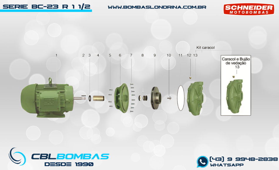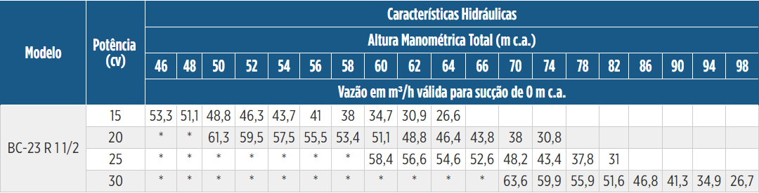 O modelo BC-23 R 1 1/2 pertence à linha BC-23, a maior linha monoestágio não normalizada da Schneider. Sua nomenclatura é baseada na linha a qual pertence e pelo seu bocal de saída de 1 1/2″, sendo sua sucção de 2″. A faixa de operação que este modelo atende destina-se à aplicações com pressões de médias a altas (46mca até 98mca), e as vazões podem chegar até 63m³/h. Muito utilizada em irrigações, na indústria e em prevenções de incêndio (conheça a BPI-23), abastecimentos de grande porte e outras aplicações de maior porte. Tudo isto é possível devido sua construção simples e robusta, que traz para este equipamento a versatilidade necessária, e referendada pelos materiais de construção de alta qualidade, podendo ser aplicada com fluídos em altas temperaturas. Disponível somente com bocais ROSCADOS (BSP). Para sua motorização, o modelo é disponibilizado nas versões Mancal, Monobloco Elétrica e SMOT (somente bombeador, para motor próprio previamente existente).