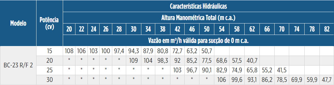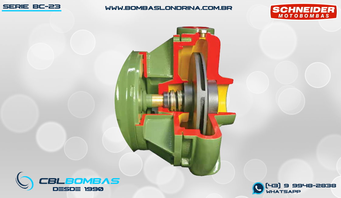 O modelo BC-23 R 2 é o maior linha BC-23, sendo então a maior bomba monoestágio não normalizada da Schneider. Sua nomenclatura é baseada na linha a qual pertence (BC-23) e pelo seu bocal de saída de 2″ (sucção de 3″), e as letras “R” ou “F” indicam a versão com bocal ROSCA BSP ou FLANGE com contra flanges inclusas. A faixa de operação que este modelo atende destina-se à aplicações com pressões de médias a altas (20mca até 82mca), e as vazões podem chegar até 109 m³/h. Muito utilizada em irrigações, na indústria e em prevenções de incêndio, abastecimentos de grande porte e outras aplicações de maior porte. Tudo isto é possível devido sua construção simples e robusta, que traz para este equipamento a versatilidade necessária, e referendada pelos materiais de construção de alta qualidade, podendo ser aplicada com fluídos em altas temperaturas. Entre todas versões da linha BC-23, o modelo BC-23 R 2 é o único Disponível com bocais ROSCADOS (BSP) ou Flangeados com contra flanges inclusas, sendo que este recebe a nomenclatura BC-23 F 2. Para sua motorização, o modelo é disponibilizado nas versões Mancal, Monobloco Elétrica e SMOT (somente bombeador, para motor próprio previamente existente).