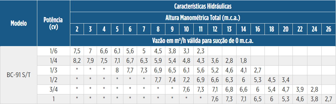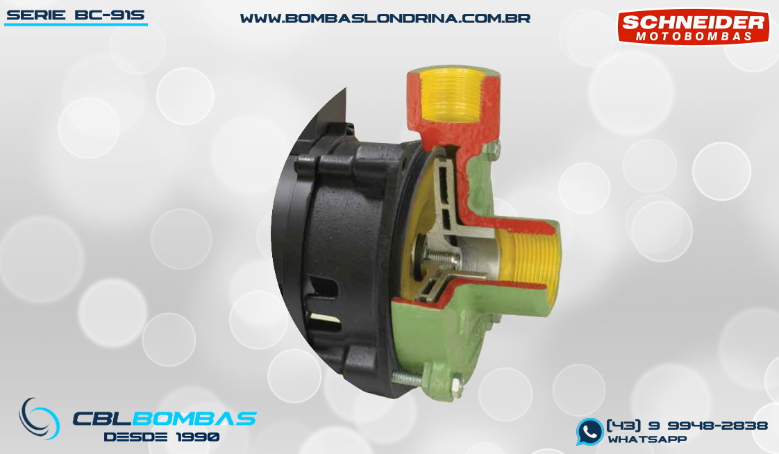 A linha BC-91 S da Schneider é a menor bomba monoestágio da linha industrial / profissional. Nem por isto é um equipamento considerado pequeno, uma vez que possui uma faixa de trabalho bastante elástica e versátil, atendendo de 2 a 26 mca e de 8,2 a 1,8m³/h, tudo isto dentre suas 6 opções de motorização/potência. Com construção do tipo IN-LINE, possui bocal de sucção central e saída superior. A versão S (sem intermediário) é indicada para fluídos até 40 Celsius, mas está também disponível também nas versões T (com intermediário) e BR (totalmente em bronze = para fluídos em temperatura) Pode ser adquirida nas opções com motor elétrico, mancalizada e SMOT (sem motor para montagem monobloco em motor próprio). As aplicações são as mais variadas: Recalque industrial, predial e agrícola; irrigação de pequeno porte, águas de reuso e outros