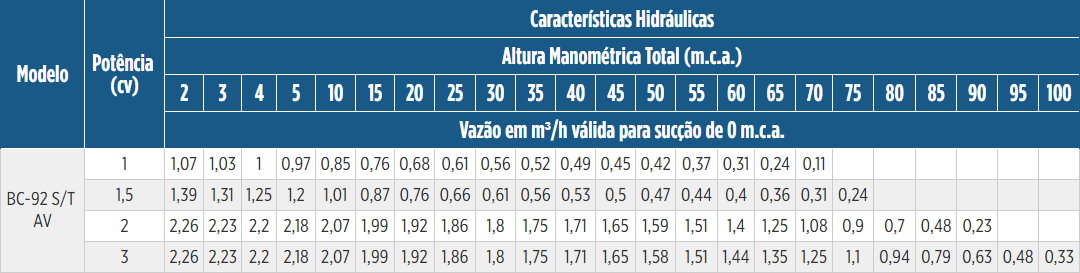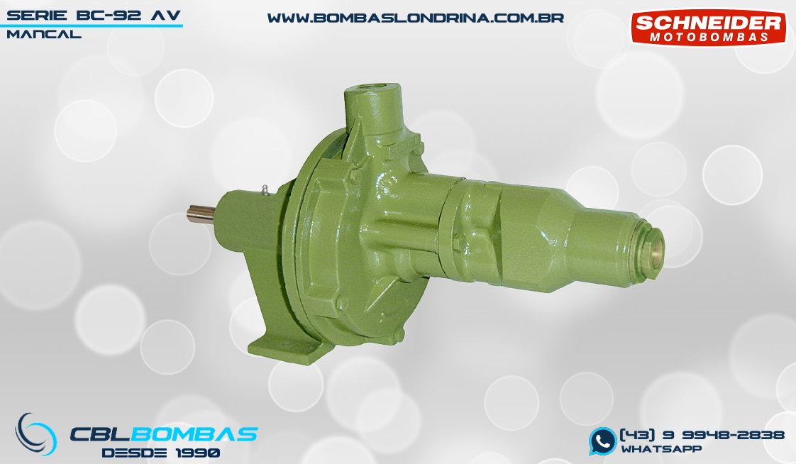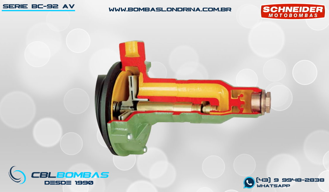 As bombas BC-92 S AV da Schneider são diferenciadas por possuírem em sua sucção um injetor incorporado (ou injetor interno). A função deste injetor é proporcionar elevadas pressões (até 100 mca) por meio do venturi do injetor. No entanto, cabe desde já ressaltar que as bombas BC-92 S AV vêm sendo substituída pelas bombas da linha BT4 que são do tipo BOOSTER (alta pressão), que acabam por fazer o mesmo serviço desta linha com menor potência consumida de motor. (veja em produtos relacionados abaixo) Voltando a falar da linha BC-92 S AV, estas bombas possuem ALTAS PRESSÕES com BAIXAS VAZÕES, e sua nomenclatura “AV” veio da principal aplicação para a qual foi desenvolvida: Aspersão em bicos de NEBULIZAÇÃO EM AVIÁRIOS E ESTUFAS, porém, pode ser também utilizada como bomba JOCKEY em prevenção de incêndio A única diferença existente entre as versões “S” e “T” é a presença do chamado INTERMEDIÁRIO, sendo que na versão “S” é SEM intermediário e na versão “T” é COM intermediário. (conheça a versão T nos produtos relacionados abaixo).