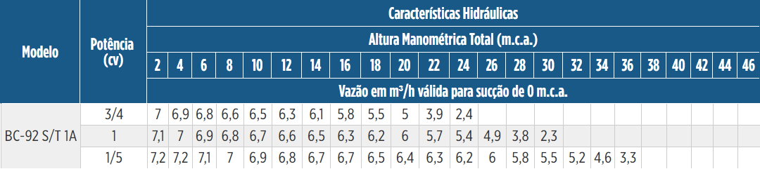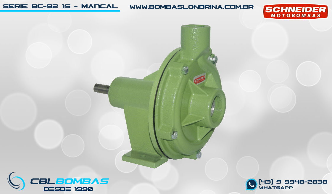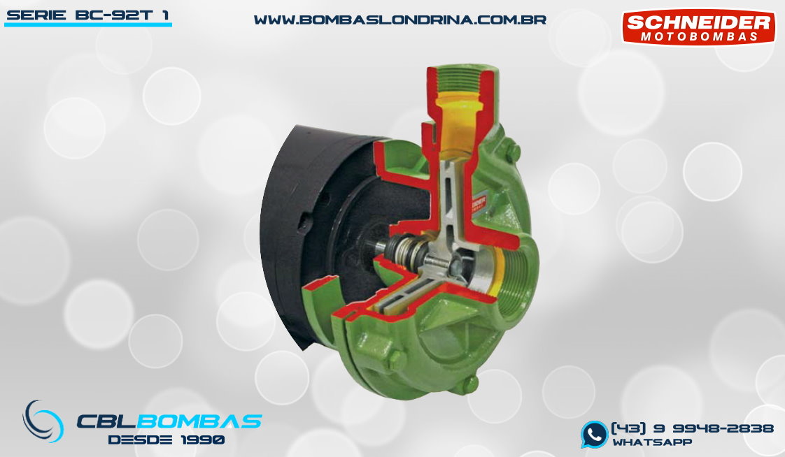 A linha BC-92 T 1A da Schneider bombas substituiu a antiga linha “BC-92 K” e tem como características vazões médias e pressões mais elevadas. Isso faz com que ela tenha uma curva de performance elástica, operando de 2 a 36mca (1,5cv). Fabricada somente com bocais roscados ( 1 1/2″ x 1″). A letra “T” em seu modelo indica ser a versão COM INTERMEDIÁRIO, que afasta o bombeador do motor. Fabricada somente com bocais roscados ( 1 1/2″ x 1″), possui de linha rotor em ALUMÍNIO mas pode ser solicitação em versão opcional com rotor em BRONZE. Todo o seu bombeador (Caracol + intermediário) é construído em Ferro Fundido GG-15. Este modelo é indicado em aplicações com necessidade de mais pressão do que vazão, encaixando bem em arcos de nebulizações, recalques com maior altura manométrica, aplicação em serpentinas e outras.