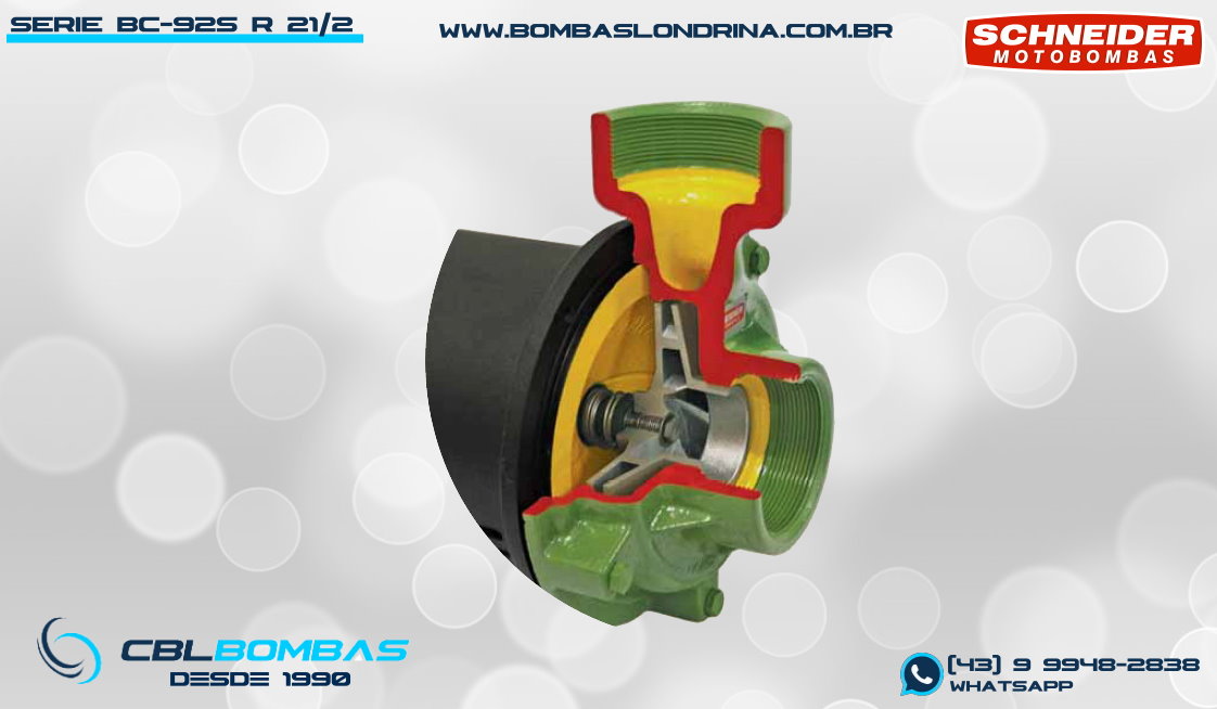 A linha BC-92 T 1C da Schneider bombas é o último lançamento da família BC-92 e consegue se estabelecer entre as versões “1A” e “1B” por atender os dois quesitos, ou seja, alta pressão da versão “1A” e alta vazão da versão “1B”, em especial a bomba com motorização de 3,0cv que atinge vazão de até 18,1 m³/h e pressão de até 46 mca (maior pressão da família BC-92). Fabricada somente com bocais roscados ( 1 1/2″ x 1″), possui de linha rotor em ALUMÍNIO mas pode ser solicitação em versão opcional com rotor em BRONZE. Todo seu bombeador (Corpo + tampa traseira) é construído em Ferro Fundido GG-15 e por isto pode ser utilizada em fluídos em alta temperatura. A letra “T” em seu modelo indica ser a versão COM INTERMEDIÁRIO. Para a versão SEM INTERMEDIÁRIO a Schneider possui a versão “S” do mesmo modelo. (veja em produtos relacionados abaixo). O modelo BC-92 T 1C foi otimizado para atender principalmente prédios de até 12 andares, bem como sistemas de recirculação e resfriamento de máquinas e torres de resfriamento. É também muito utilizada em irrigações de pequeno/médio porte, por aspersor ou gotejo.