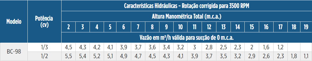 | Motor | Rotor | Vazão | Bocais | Pressão | Potência |