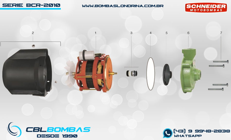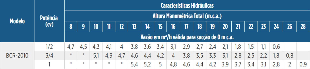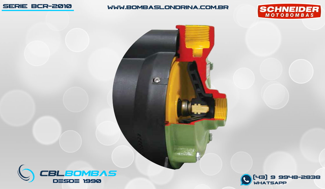 O modelo BCR-2010 é a evolução do modelo BCR-2000 (ainda em linha) e possui potências mais elevadas que modelo antigo (até 1,0cv). Sua parte construtiva se difere do modelo antigo por ter o rotor em NORYL®, COM 30% DE FIBRA DE VIDRO para mair resistência. Caracol e tampa traseira são em Ferro Fundido e selo mecânico em BUNA + INOX (veja lista de peças abaixo) Sua aplicação é exclusivamente residencial e atente alturas de até 27mca, com vazão máxima de 5,4m³/h (versão 1,0cv) para líquidos em até 55°C. Pode ser usado em residências, chácaras, pequenas irrigações, sistemas de circulação de água, fontes, cascatas e outros. Seu motor é WEG do tipo IP-00, que é transformado em IP-21 pela Schneider, com capa de proteção, proteção térmica e capacitor permanente.