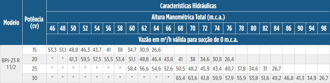 | Motor | Rotor | Vazão | Bocais | Pressão | Potência |
