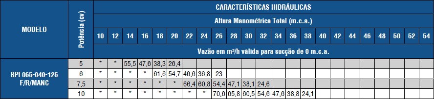 | Motor | Rotor | Vazão | Bocais | Pressão | Potência |