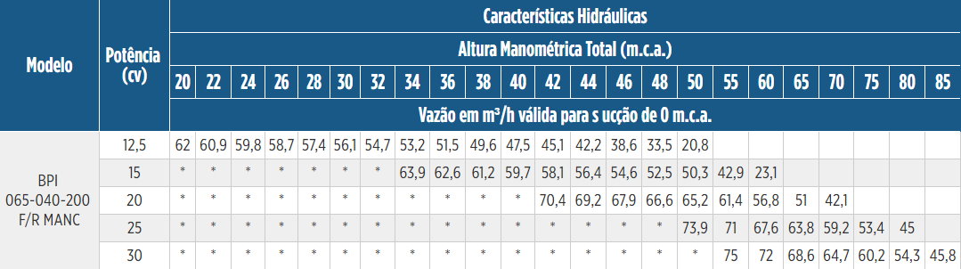 | Motor | Rotor | Vazão | Bocais | Pressão | Potência |
