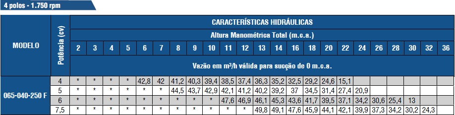 | Motor | Rotor | Vazão | Bocais | Pressão | Potência |