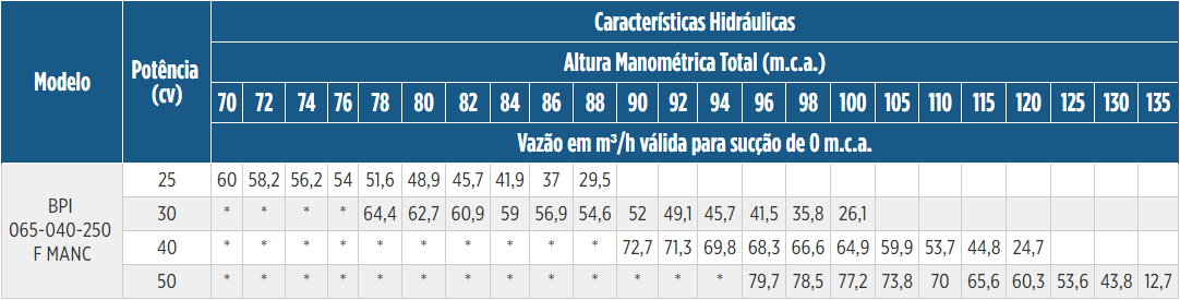 | Motor | Rotor | Vazão | Bocais | Pressão | Potência |