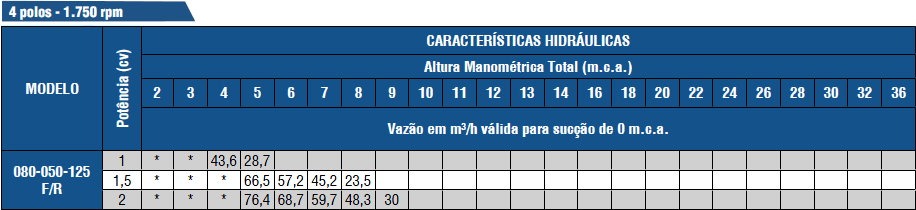 | Motor | Rotor | Vazão | Bocais | Pressão | Potência |