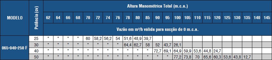 | Motor | Rotor | Vazão | Bocais | Pressão | Potência |