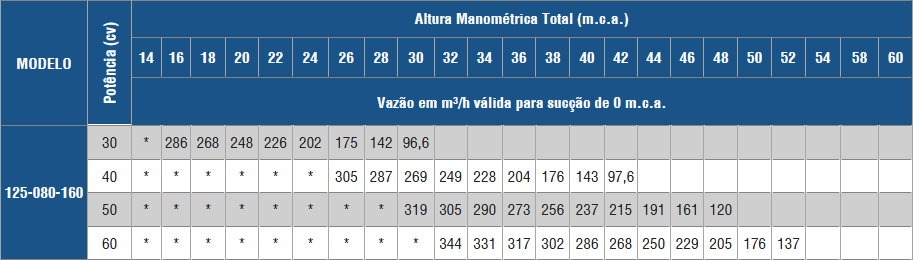| Motor | Rotor | Vazão | Bocais | Pressão | Potência |