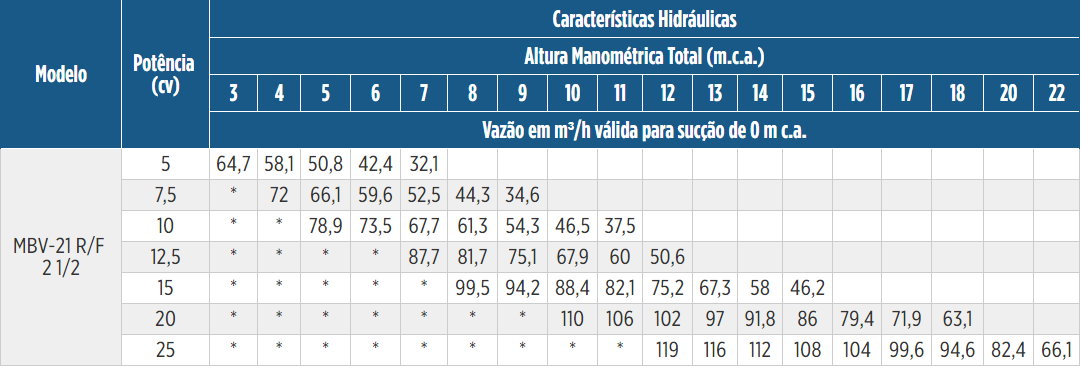 O modelo MBV-21 F 2 1/2 têm capacidade de sução de até 8mts a nível do mar, porém como a presença dos sólidos pode ocasionar o travamento da válvula de sucção, o fabricante recomenda sua utilização sempre em regime AFOGADO (por gravidade até o bocal de entrada da bomba)