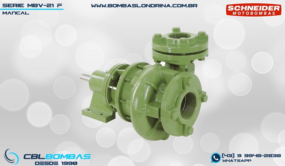 As Bombas MBV-21 F 2 1/2 da Schneider fazem parte da linha industrial pesada com rotores VORTEX (à prova de entupimentos), e permitem o bombeamento de fluídos com sólidos em suspensão de até 42mm de diâmetro, respeitando uma proporção de 30% de sólidos + 70% de líquido em mistura homogênea.
