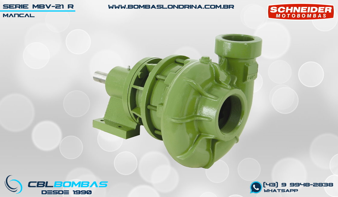 As Bombas MBV-21 R 2 1/2 da Schneider fazem parte da linha industrial pesada com rotores VORTEX (à prova de entupimentos), e permitem o bombeamento de fluídos com sólidos em suspensão de até 42mm de diâmetro, respeitando uma proporção de 30% de sólidos + 70% de líquido em mistura homogênea. Por ser uma bomba de rotor aberto, é característico deste tipo de bomba ter grandes vazões e baixas alturas manométricas. (vazões entre 64,7 mil litros hora e 119mil litros hora, e pressão máxima de 23 mca) Destaque para o material construtivo do rotor, que é em Ferro Fundido NODULAR, para suportar o atrito com os sólidos em suspensão. O rotor trabalha afastado do bocal de entrada para melhor performance (veja detalhe da bomba em corte na galeria de imagens) Dentre todos os produtos da linha Schneider, este é o que possui mais opções de potência disponível, são 7: 5,0cv | 7,5cv | 10,0cv | 12,5cv | 15,0cv | 20,0cv | 25,0cv. Podem ser adquiridas com motor elétrico em montagem monobloco, mancal eixo livre para montagem em motorização externa ou SMOT (somente bombeador, para montagem monobloco em motor próprio previamente existente) O modelo MBV-21 R 2 1/2 têm capacidade de sução de até 8mts a nível do mar, porém como a presença dos sólidos pode ocasionar o travamento da válvula de sucção, o fabricante recomenda sua utilização sempre em regime AFOGADO (por gravidade até o bocal de entrada da bomba) A versão “R” possui bocais ROSCADOS padrão BSP, nas medidas 3″ x 2 1/2″ (sucção x recalque), enquanto a versão “F” possui bocais FLANGEADOS (veja em produtos relacionados abaixo)