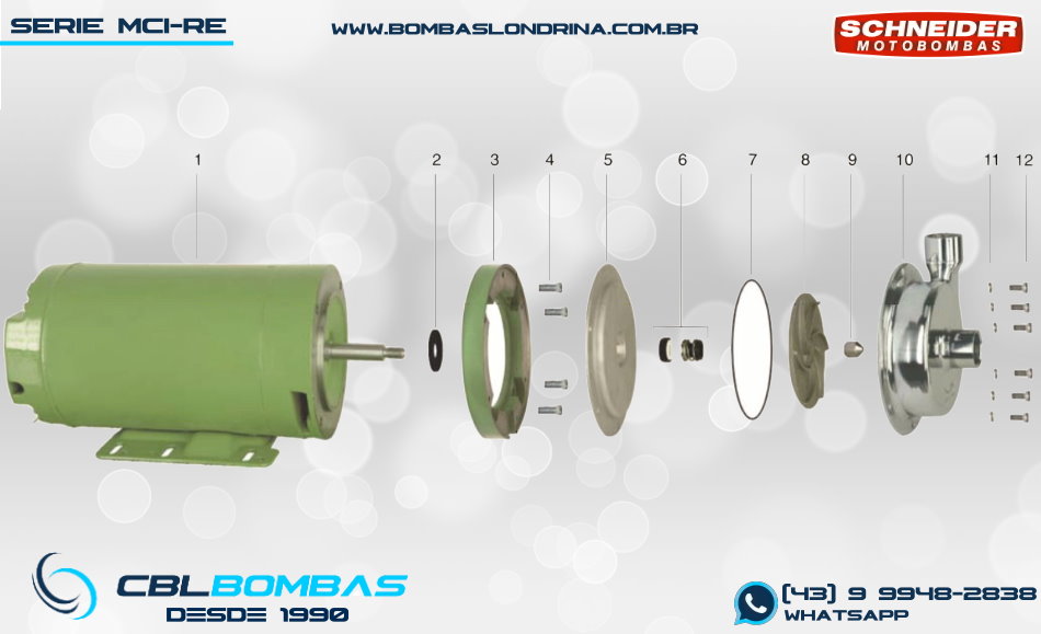 As bombas da linha MCI-RE são construídas TOTALMENTE EM AÇO INOX 316 estampado. Seu rotor é do tipo SEMI ABERTO, que permite passagem de sólidos de até 2,5mm. Sua vedação é por meio de Selo Mecânico com as partes metálicas em INOX 316 e seus elastômeros podem ser em BUNA / VITON / EPDM (BUNA no produto de linha), e sedes estacionárias e rotativas em Carvão X Cerâmica no produto padrão (opcional em silício). A conexão entre o bombeador e o motor é feita por um “disco intermediário” em GG-15 (vide explodido de peças abaixo)