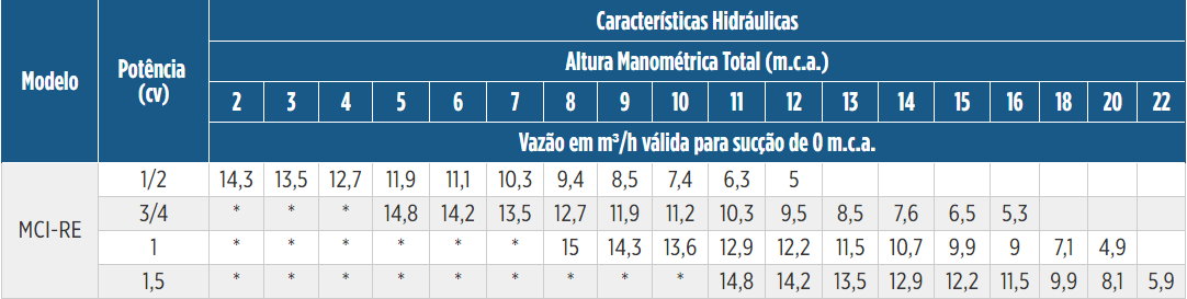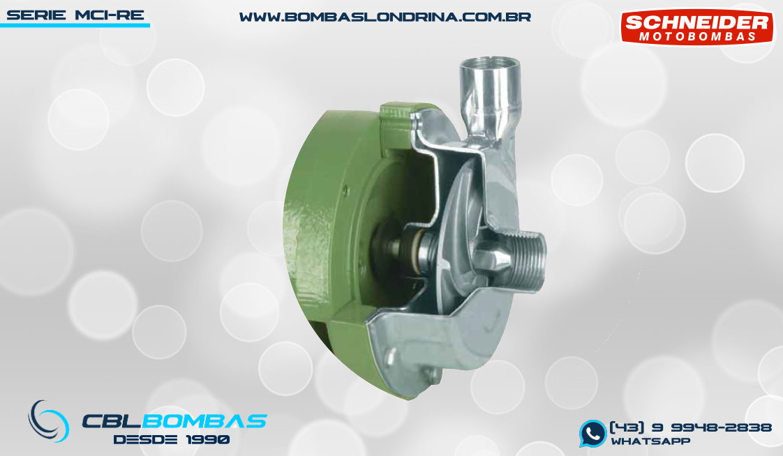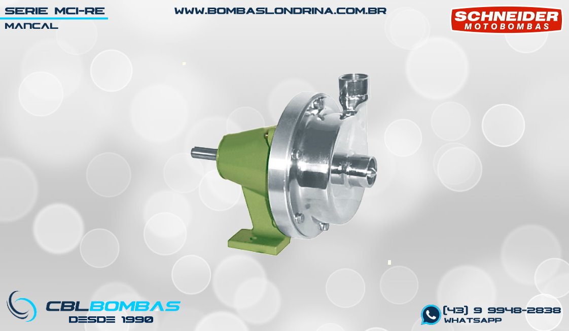 O modelo MCI-RE está disponível com motores da marca WEG nas versões ABERTO IP-21 e FECHADO IP-55, além das opções mancal eixo livre (mancalizada) para acoplamento em motorização externa e SMOT (somente o bombeador, para montagem em motor próprio previamente existente. Esta linha de bombas é indicada para o bombeamento de produtos químicos, águas com resíduos ácidos ou alcalinos, recirculação em lavador de gases com resíduos químicos, tratamento de efluentes pré gradeados, vinhoto e outras aplicações industriais Para garantia da compatibilidade de materiais construtivos do equipamento com seu fluído, faça sempre uma consulta específica indicando o FISPQ do seu fluído. Se você busca bombas em inox para aplicação alimentícia, este produto não é o indicado. Para este uso, o indicado são as bombas em inox do tipo SANITÁRIA