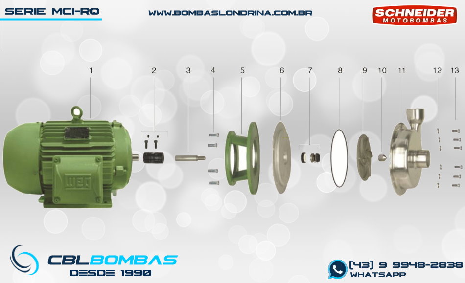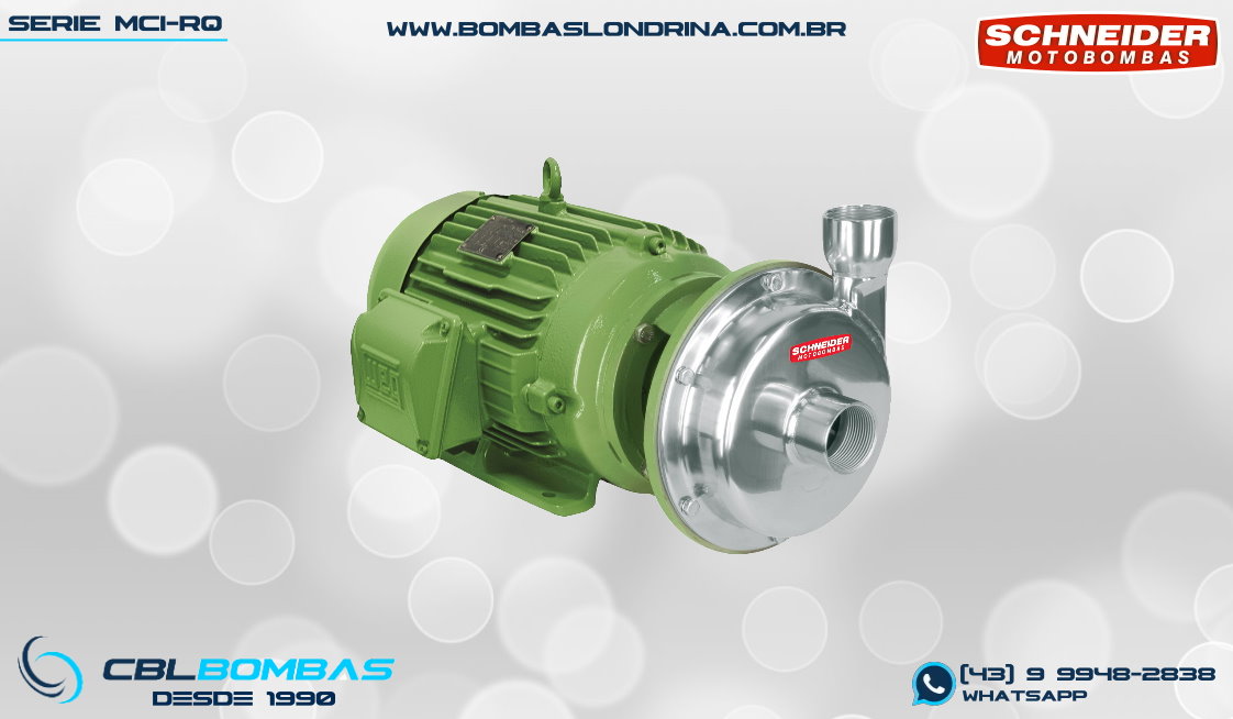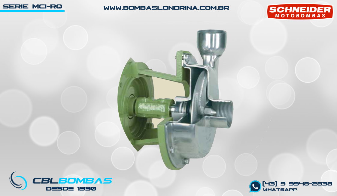 As bombas da linha MCI-RQ são construídas TOTALMENTE EM AÇO INOX 316 estampado. Seu rotor é do tipo SEMI ABERTO, que permite passagem de sólidos de até 2,5mm. Sua vedação é por meio de Selo Mecânico com as partes metálicas em INOX 316 e seus elastômeros podem ser em BUNA / VITON / EPDM (BUNA no produto de linha), e sedes estacionárias e rotativas em Carvão X Cerâmica no produto padrão (opcional em silício). A conexão entre o bombeador e o motor é feita por um “disco intermediário” em GG-15 (vide explodido de peças abaixo) O modelo MCI-RE está disponível com motores da marca WEG nas versões ABERTO IP-21 e FECHADO IP-55, além das opções mancal eixo livre (mancalizada) para acoplamento em motorização externa e SMOT (somente o bombeador, para montagem em motor próprio previamente existente. Esta linha de bombas é indicada para o bombeamento de produtos químicos, águas com resíduos ácidos ou alcalinos, recirculação em lavador de gases com resíduos químicos, tratamento de efluentes pré gradeados, vinhoto e outras aplicações industriais Para garantia da compatibilidade de materiais construtivos do equipamento com seu fluído, faça sempre uma consulta específica indicando o FISPQ do seu fluído. Se você busca bombas em inox para aplicação alimentícia, este produto não é o indicado. Para este uso, o indicado são as bombas em inox do tipo SANITÁRIA