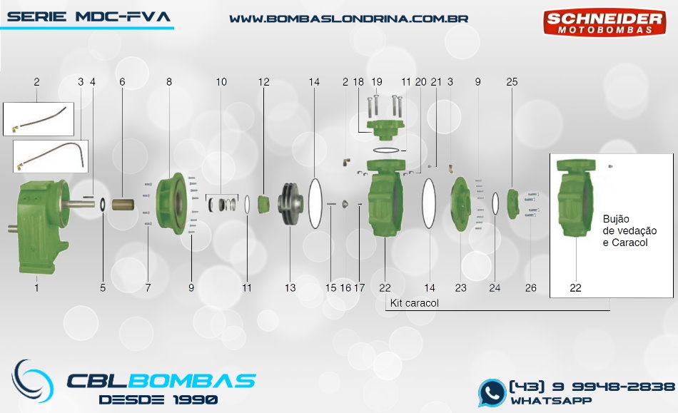 bomba schneider monoestágio para fluídos sem sólidos. disponível nas potências de 3/4cv , 1,0cv e 1,5cv.