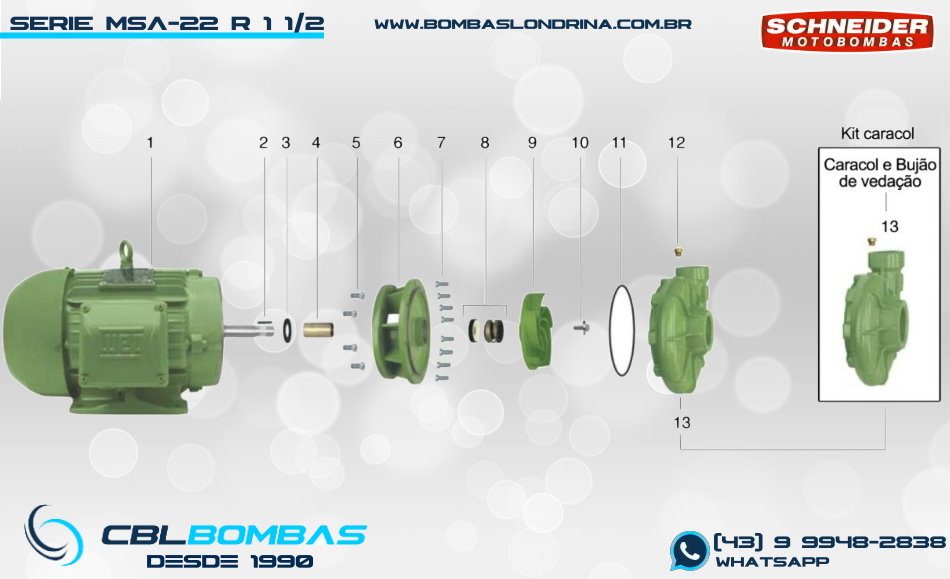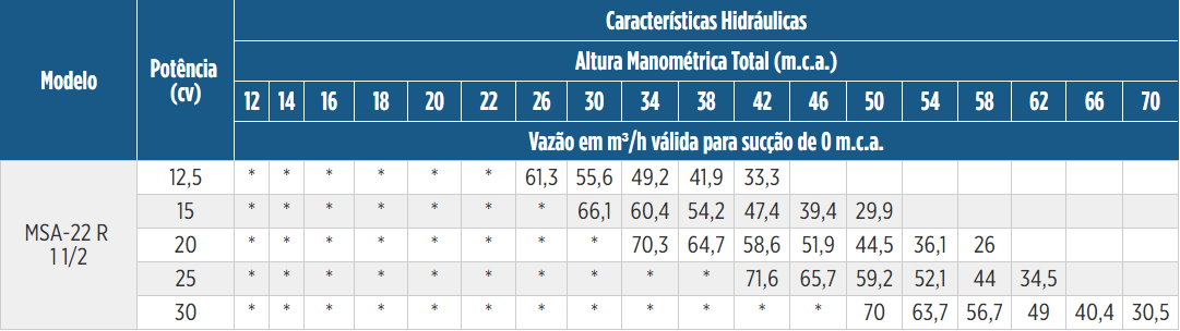 As bombas MSA-22 R 1 1/2 são bombas de rotor SEMI ABERTO: Chamamos de SEMI ABERTO os rotores que possuem a face aberta, mas que trabalham muito próximos à voluta da bomba que acaba por fazer o papel da face frontal do rotor. (veja detalhe em corte na galeria de imagens). Neste modelo em específico, a passagem de sólidos permitida é de 6mm de diâmetro, sempre respeitando a proporção de 30% de sólidos + 70% de líquido em uma mistura homogênea. Para isto, o rotor é construído em FERRO FUNDIDO NODULAR, material de maior dureza para suportar o atrito dos sólidos durante o bombeamento A família MSA-22 foi concebida para atender aplicações que tenham além da presença de sólidos na água, situações onde seja necessário uma maior pressão, até 70mca com a MSA-22 R 1 1/2 de 30,0cv Quando falamos em potências, este modelo possui as seguintes opções: 12,5cv | 15,0cv | 20,0cv | 25,0cv | 30,0cv. Está disponível nas versões MONOBLOCO com motor elétrico WEG tipo IP-55 Fechado; mancalizada para montagem em força motriz externa (mancal eixo livre) e SMOT (somente o bombeador para montagem monobloco em motor próprio previamente existente) Veja as informações completas do produto abaixo, com curvas de redimento, dimensional, lista de peças e muito mais