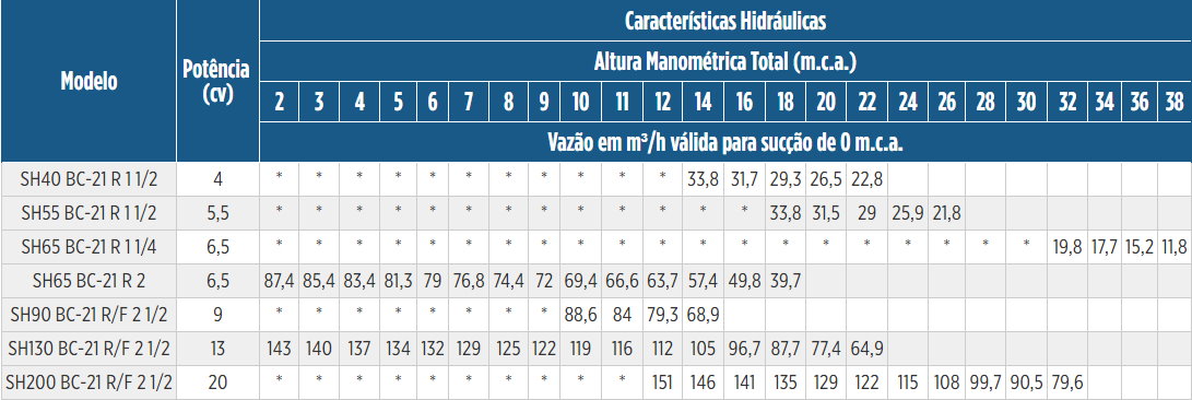| Motor | Rotor | Vazão | Bocais | Pressão | Potência |