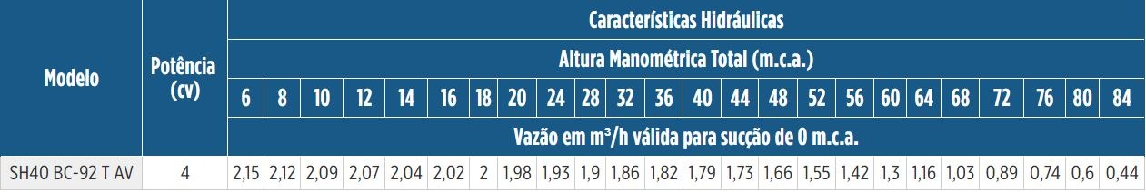 | Motor | Rotor | Vazão | Bocais | Pressão | Potência |
