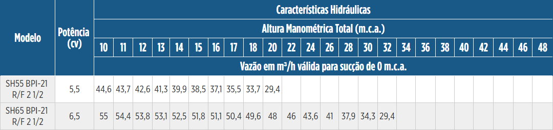 | Motor | Rotor | Vazão | Bocais | Pressão | Potência |