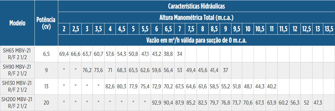 | Motor | Rotor | Vazão | Bocais | Pressão | Potência |