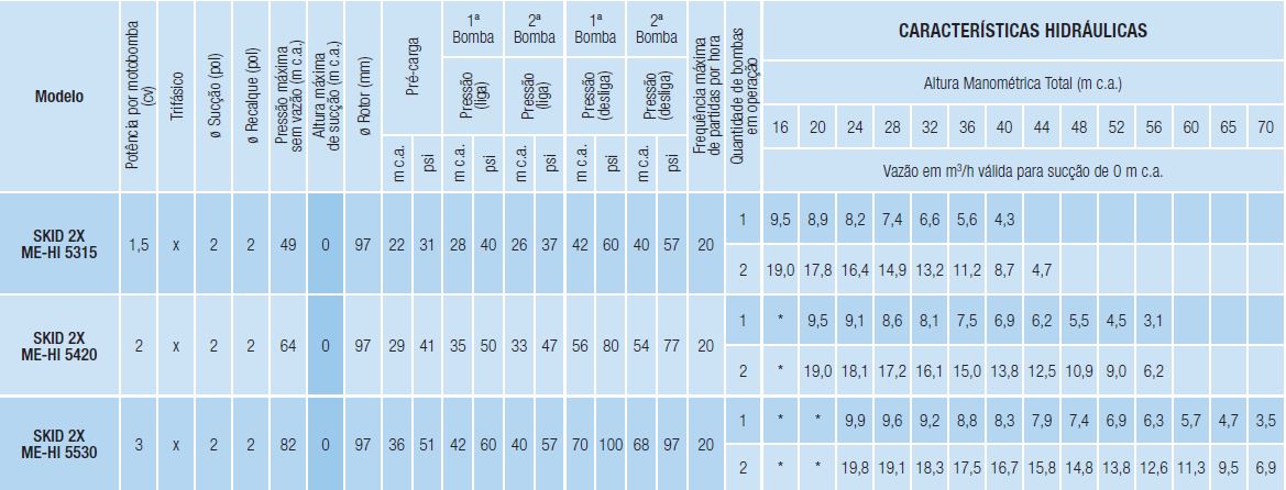 | Motor | Rotor | Vazão | Bocais | Pressão | Potência |