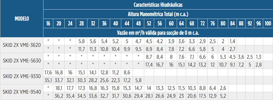 | Motor | Rotor | Vazão | Bocais | Pressão | Potência |