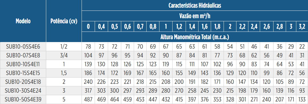 | Motor | Rotor | Vazão | Bocais | Pressão | Potência |