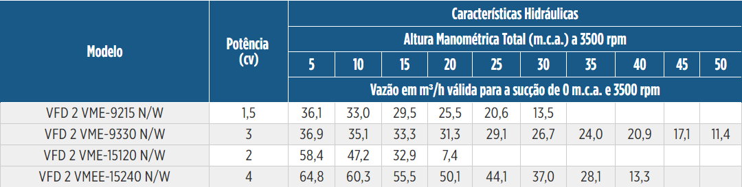 | Motor | Rotor | Vazão | Bocais | Pressão | Potência |