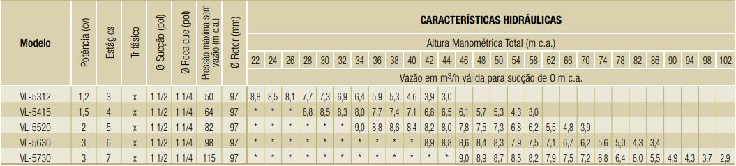 | Motor | Rotor | Vazão | Bocais | Pressão | Potência |
