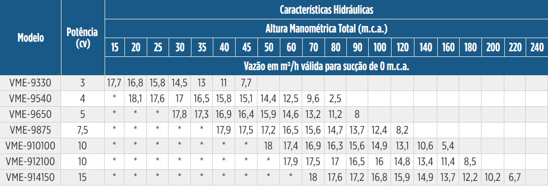 | Motor | Rotor | Vazão | Bocais | Pressão | Potência |