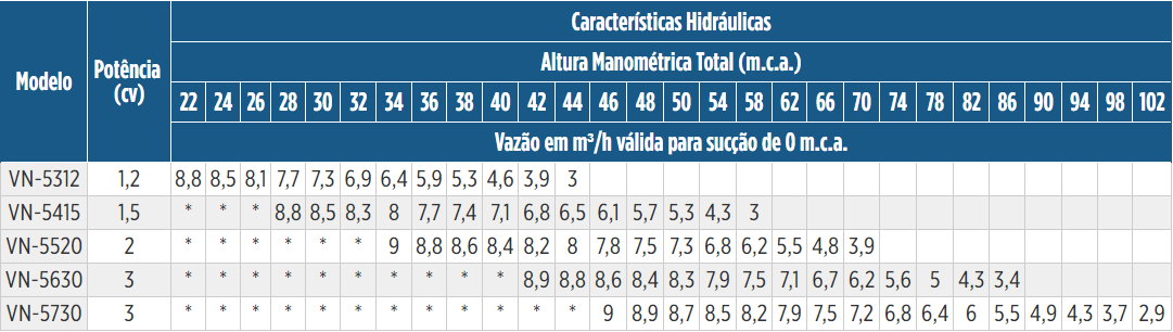 | Motor | Rotor | Vazão | Bocais | Pressão | Potência |